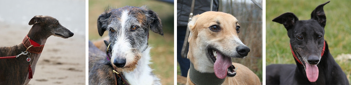 (links 2 Galgo’s, rechts 2 Greyhounds)