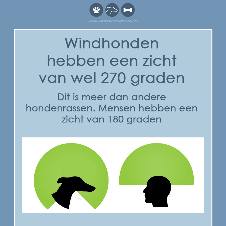 Windhonden kunnen veel meer zien dan mensen. Op een afstand van 800 meter kunnen ze hun prooi al zien. En waar mensen een zicht hebben van 180 graden is dat bij windhonden wel 270 graden. Dat is zelfs meer dan de meeste andere hondenrassen!