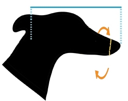 Meet met een liniaal de zijkant van de kop van net achter het oor tot aan het puntje van de neus (blauwe lijn). Kies een muilkorf die eenzelfde of kortere totale lengte heeft (d.m.v. de riempjes kan de muilkorf versteld worden)