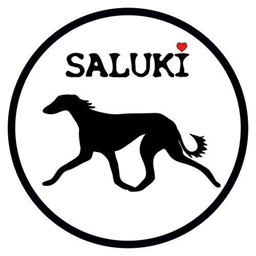 In het midden van de sticker zie je het silhouet van een Saluki met daarboven het woord “Saluki” waarbij het puntje op de i vervangen is door een rood hartje. Een subtiel detail dat de liefde voor dit bijzondere ras benadrukt.