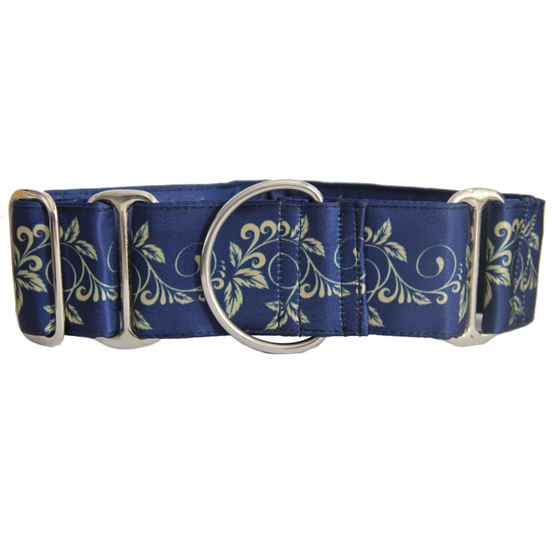 Martingale halsband met blauw-goud patroon.