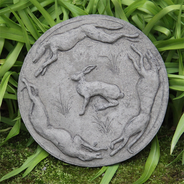 Een ronde plaat van beton met daarop afgebeeld 3 rennende windhonden en 1 haas.